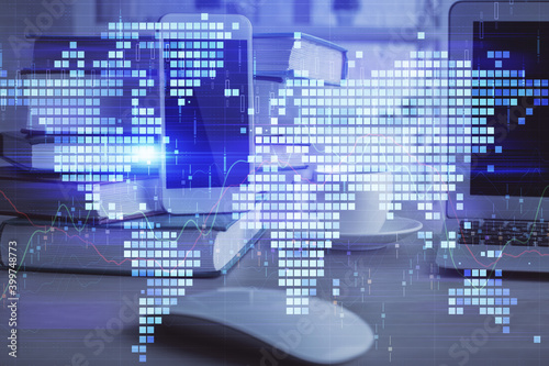 Double exposure of financial theme drawing and cell phone background. Concept of business