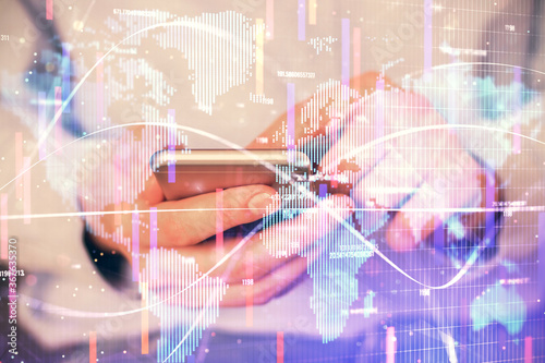 Double exposure of man's hands holding and using a phone and international business theme drawing.