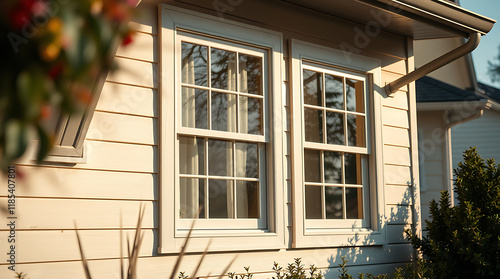 Double-Hung Windows in Beige Clapboard House