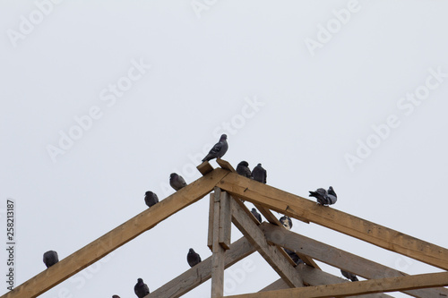 Dove in the sky, on the roof of the house.