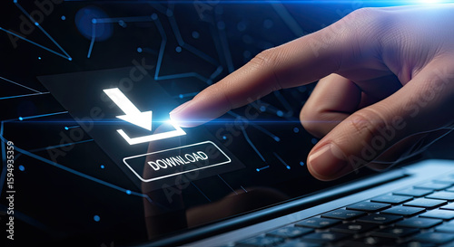 Downloading Data Concept: Finger pressing download button on a digital screen with glowing blue network. Modern technology and data transfer concept.