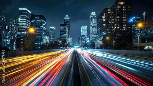 Drag racing car tearing through a cityscape at night. Featuring speed and excitement