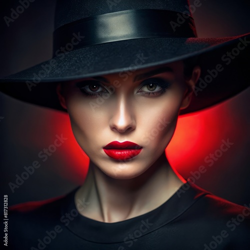 mysterious, woman, black, hat, red, colours, scheme, closeup, plan, portrait, dark, background, shadow, mystery, riddle, look, make-up, elegance, fashion, style, glamour, beauty, femininity, drama, night, piquancy, darkness, silhouette, contrast, intrigue, passion, attractiveness, mysticism, sensuality, gothic, mood, romance, charisma