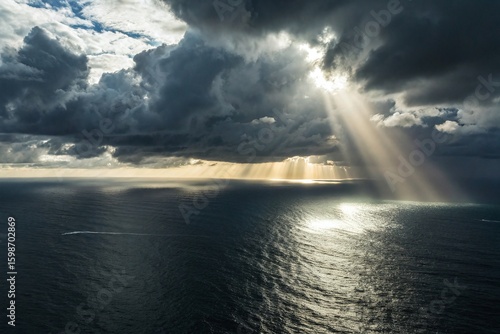 Dramatic aerial view captures dark ocean under moody clouds during sunset with rays of light breaking through