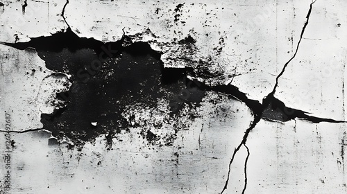 cracked, surface, texture, wall, paint, damaged, broken, aged, weathered, grunge, distressed, abstract, background, black, white, grey, monochrome, peeling, decay, ruin, deterioration, flaw, imperfection, fractured, fracture, cleaving, hole, evacuated, gap, damage, debris, erosion, rough, uneven, mottled, splatter, stain, shadow, dark, light, contrast, pattern, design, material, surface texture