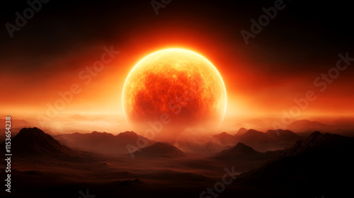 Dramatic celestial event cosmic landscape digital art surreal environment atmospheric viewpoint exploring co2 impact on planet health