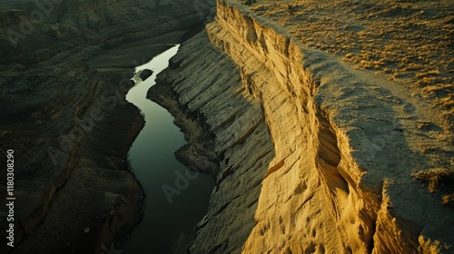 Dramatic cliffs meet winding river under golden sunlight, showcasing nature's grandeur in a breathtaking landscape.