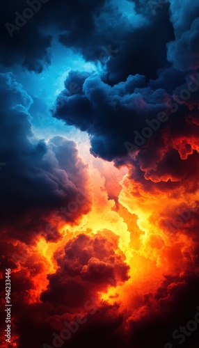 Dramatic clouds with vibrant colors of blue and orange, creating a spectacular natural scene resembling fire and ice.