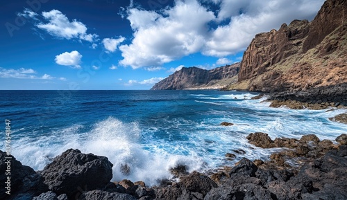 Dramatic coastal scenery with powerful waves crashing on volcanic rocks, a vibrant blue ocean, and towering cliffs