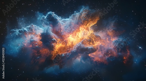 Dramatic cosmic nebula explosion with vibrant colors and powerful energy in the depths of the mysterious universe Stunning celestial phenomenon of swirling stellar gases and interstellar dust clouds