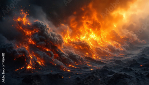 lava, fire, heat, landscape, dark, cloud, smoke, rugged, terrain, flow, volcanic, magma, ash, glow, burning, eruption, hot, intense, geology, nature, natural, disaster, danger, energy, powerful, molten, orange, black, grey, abstract, pattern, texture, movement, dynamic, formation, surface, atmosphere, sky, night, inferno, ominous, environment, flames, red, burn, sunset, balefire, light, flames