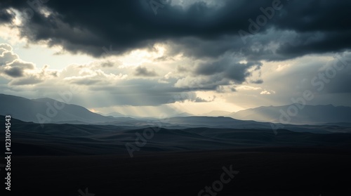 landscape, mountain, cloud, sky, sun, ray, light, dark, hill, nature, dramatic, overcast, moody, weather, atmospheric, scenery, terrain, huge, horizon, wilderness, peaceful, calm, serene, quiet, majestic, shadow, silhouette, gradient, environment, sunlight, twilight, dawn, dusk, vista, view, travel, adventure, exploration, untouched, remote