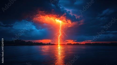storm, lightning, thunder, rain, cloud, sunset, sunrise, river, nature, sky, dramatic, powerful, intense, electricity, weather, storm cloud, high-coloured, colours, landscape, horizon, water, dark, light, energy, vivid colors, awe, huge, magnificent, spectacular, breathtaking, destructive, beautiful, power, lightning strike, dark clouds, natural disaster, fierce, violent, wild, raging, force