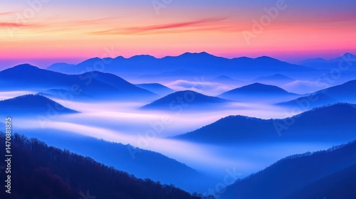 sky, mountain, cloud, mist, fog, haze, sunset, sunrise, dawn, dusk, horizon, vale, range, peak, elevation, slope, tree, silhouette, light, shadow, blue, purple, orange, pink, red, gradient, atmosphere, view, landscape, nature, serene, peaceful, tranquil, calm, wilderness, natural, scenic, breathtaking, majestic, panoramic, huge, dramatic, aethereal, vibrant, picturesque, beautiful, layered, perspective
