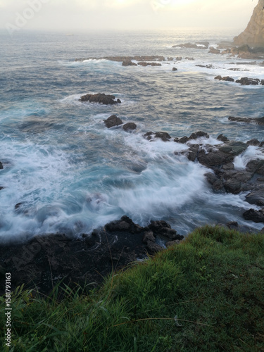 Dramatic ocean view with misty waves and rugged rock formation, the green grass in the foreground gives natural accent to the seascape.