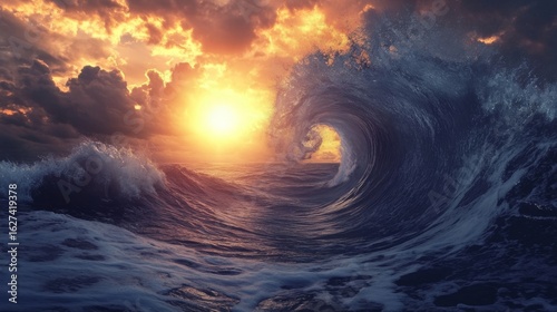 Dramatic ocean wave with golden sunset sky. Concept of nature's power, wonder and beauty.
