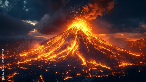 Dramatic photo capturing a fiery volcanic eruption with glowing lava flows and a dark ominous sky above.