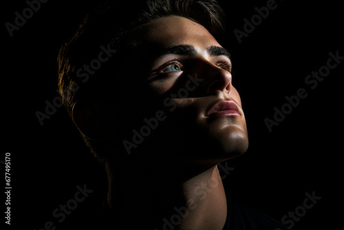 Dramatic portrait of a young man half expressionless face in deep shadow looking up isolated on black background