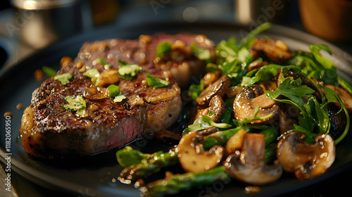 steak, new, york, disrobed, dramatic, food, cookery, epicure, dish, dinner, culinary, meat, vegetable, herb, plating, eatery, dining, meal, grill, healthy, fresh, cooking, aroma, delicious, savoury, upscale, presentation, favor, texture, garnish, asparagus, mushroom, salad, plate, rich, colours, visual, feast, enticing, bistro, premium, chef, ingredient, lifestyle, indulgence, life events, banquet