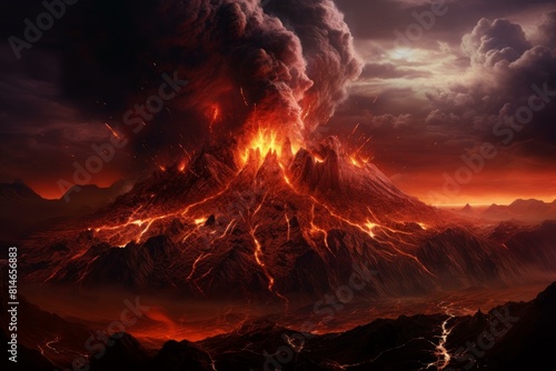 Dramatic scene of an active volcano erupting with lava flows and smoke against a dark sky