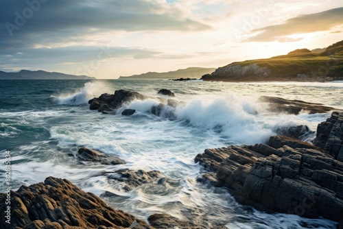 seascape, coastline, rocky shore, dramatic sky, crashing waves, sunset, ocean, nature, landscape, scenic, travel, adventure, outdoors, exploration, coastal, moody, atmospheric, serene, tranquil, scenic beauty, natural wonder, ocean view, travel destination