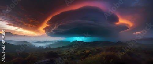dramatic, sky, paired, vibrant, land, painting, masterpiece, nature, canvas, scenery, sky, nature, outdoors, cloud, forest, mountain, landscape, tree, wide, poster, wallpaper, background