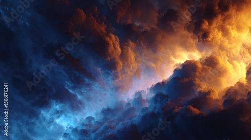 Dramatic sky featuring a collision of blue and orange clouds. A captivating celestial display evokes emotion and wonder.