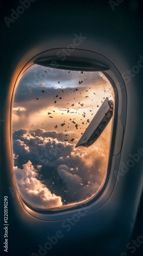 aeroplane, window, sky, emergency, sunset, cloud, debris, dramatic, view, flight, travel, aviation, crisis, tension, danger, light, shadow, perspective, atmosphere, horizon, adventure, transport, air, journey, event, outdoors, orange, pink, scene, incident, accident, risk, turbulence, twilight, escape, surreal, safety, alarm, alert, breathtaking, aerial, cloudscape, evening, suspense, stunning, warm