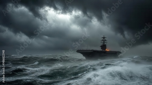 Dramatic stormy sea with a naval aircraft carrier navigating through turbulent waters