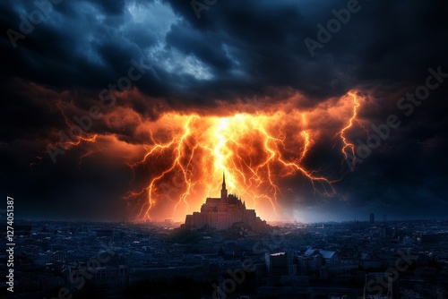 storm, lightning, castle, city, skyline, dramatic, sky, cloud, night, dark, power, nature, ancient, mediaeval, fantasy, epic, fiery, bright, intense, weather, landscape, architecture, building, ruin, history, mystery, magic, ominous, threat, danger, fear, apocalypse, destruction, chaos, energy, force, impact, battle, war, conflict, rebellion, resistance, hope, survival