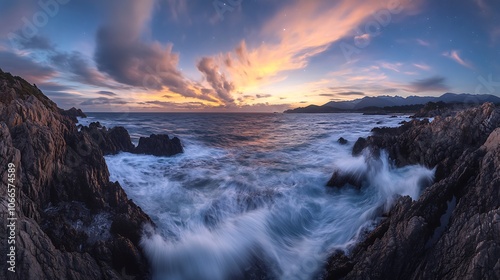 sunset, sky, cloud, ocean, water, wave, blur, rocky, coast, coastline, cliff, mountain, horizon, dramatic, landscape, seascape, nature, scenic, dusk, evening, blue, pink, orange, light, dark, foreground, background, long, exposure, photo, beautiful, tranquil, peaceful, serenity, wild, rugged, natural, view, distant, sea, foam, spray, shore, beach, calm, smooth, texture, pattern