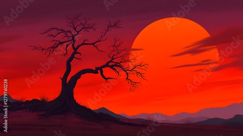 Dramatic Sunset Over Silent Landscape with Bare Tree Silhouette