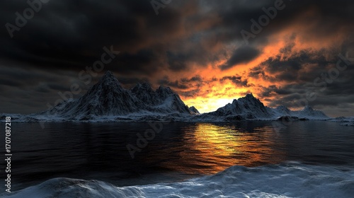 Dramatic Sunset Over Snow-Capped Mountains Reflecting in Calm Dark Waters of a Remote Arctic Landscape
