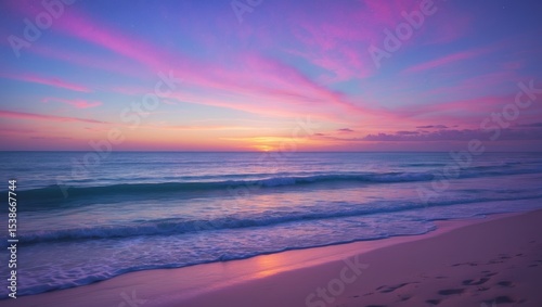 Dramatic Sunset over the Ocean. Evening sunrise over the sea with vibrant clouds. Stunning cloudscape above the sea waves and sandy tropical beach, ocean coast sunrise. Travel photo with copy space
