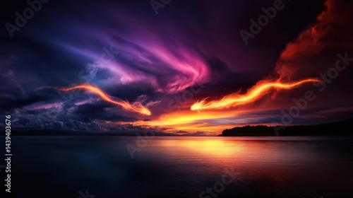Dramatic sunset over tranquil ocean with vibrant clouds