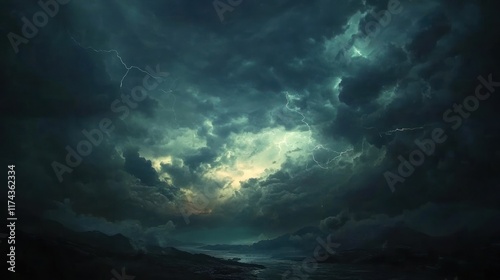 Dramatic Thunderstorm Landscape: Dark Clouds, Lightning Strikes, and Serene Waters