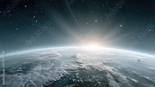 Dramatic View of Planet Earth from Space with Bright Sun Rays and Distant Stars Against Dark Cosmic Background