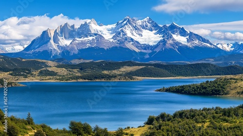 Dramatic view of Torres del Paine mountains over a lake in Chile's Patagonia region on a clear day during summer season