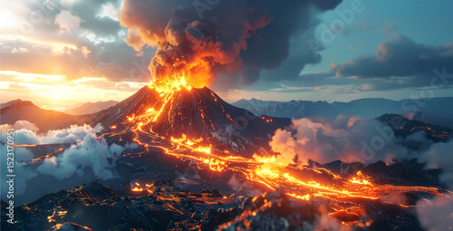 volcano, eruption, lava, fire, smoke, ash, natural disaster, danger, powerful, dramatic, mountain, landscape, nature, hot, glowing, active volcano, destruction, climate, earth science, geology, explosion, aerial view, panoramic, sunset, sunrise, cloud, sky, fiery, red, orange, black, risk, hazardous