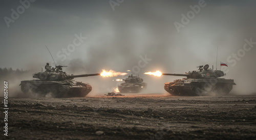 Dramatic War Scene: Tanks Firing in Dusty Battlefield
