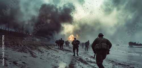 Dramatic wartime scene with soldiers running on beach amidst explosions and smoke, highlighting the chaos and intensity of battle.