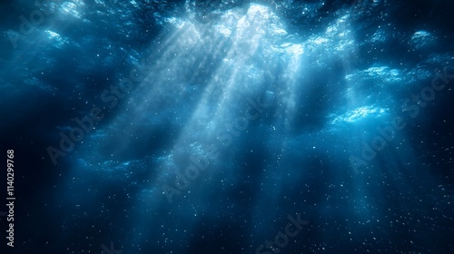 Dramatic underwater scene featuring silhouetted diver in deep ocean abyss, illuminated by piercing sunbeams and surrounded by bioluminescent particles in clear water.