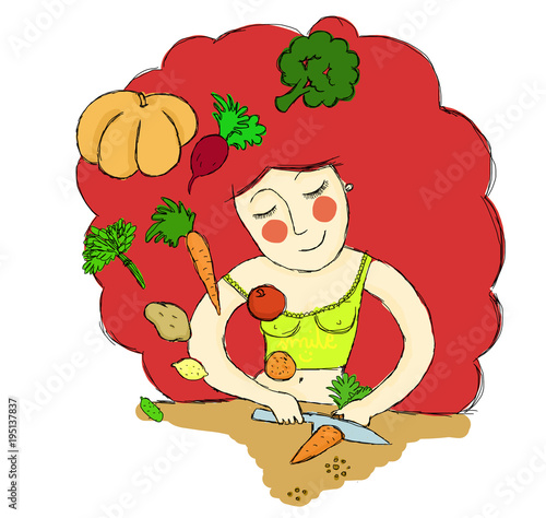 drawing. Happy woman cooks healthy vegetables. spring, diet, nutrition