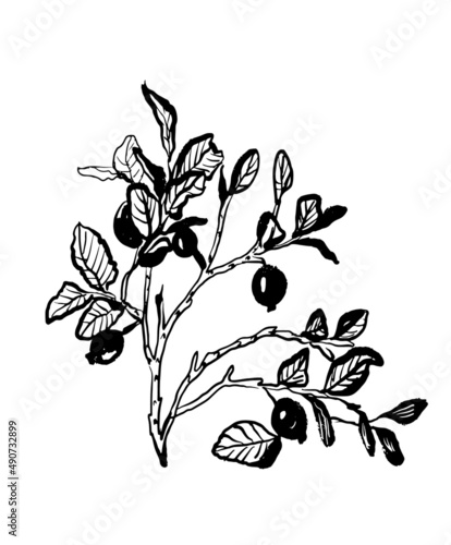 drawing picture isolated on white background blueberry twigs with leaves and berries, sketch, hand drawn digital vector illustration