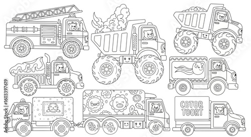 truck, vehicle, children, dump truck, fire engine, delivery truck, drawing, illustration, transportation, cartoon, outline, black-and-white, line art, clip art, transport, automotive, ladder, wheel, bear, animal, cute, fun, activity, printable, educational, design, art, graphic, image, digital artwork, colouring, page, children, preschool, kindergarten, learning, creative, artwork, vignetting, doodle, vector, clip art, paint