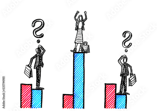 woman, success, growth, winner, graph, chart, finance, business, man, question, investor, rival, rivalry, profit, turnover, competition, financial, comparison, talent, sex, vignetting, drawn, isolated, concept, psychology, employee, drawing, illustration, line, cut-out, ink, art, cartoon, freehand, hand, artwork, challenger, businesswoman, entrepreneur, performance, entrepreneurship, mulling, successful, loss, investment, development, economy, feminism, three, people