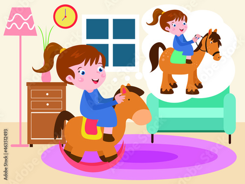 Dream vector concept. Cute little girl dreaming as an equestrian while riding a rocking horse at the home