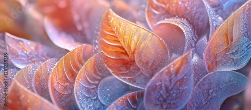 leaf, dew, pastel, iridescent, texture, abstract, nature, background, floral, botanical, design, illustration, art, fantasy, dreamy, soft, colourful, orange, blue, purple, pink, macro, closeup, detail, pattern, beautiful, elegant, organic, vibrant, shiny, glossy, smooth, water, light, photo, image, graphic