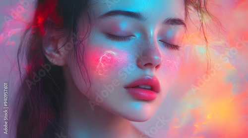 Dreamlike portrait with neon pastel colors blending into the background, soft glowing skin, eyes closed in peaceful expression, artistic aura.