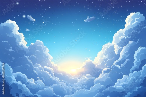 cloud, sky, blue, illustration, landscape, digital artwork, heavenly, light, atmosphere, sunset, daytime, nature, peaceful, serene, star, beautiful, scenic, colourful, vibrant, artistic, soft, weather, dreamy, horizon, depth, pure, tranquil, fluffy, puffy, creative, background, optical, aesthetic, celestial, elevated, inspiration, wonder, sunrise, aethereal, mystical, sunlight, harmony, dreamscape, dawn, silhouette